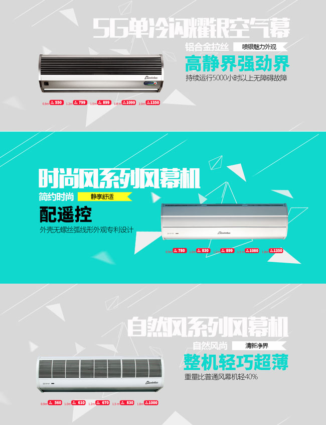 S5、時尚風、5G等系列風幕機,鋁合金外殼永不生銹,堅固不變形,外觀時尚。天花機可嵌入天花板,適用無法側(cè)裝的高檔玻璃門等特殊環(huán)境??钍截S富,系列齊全,適應各種使用環(huán)境。