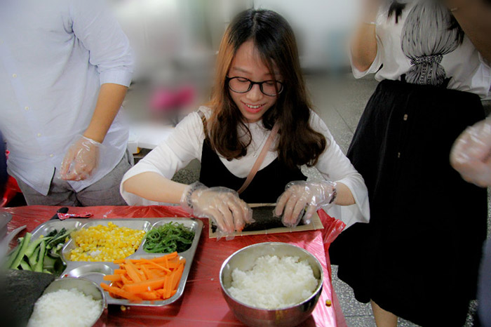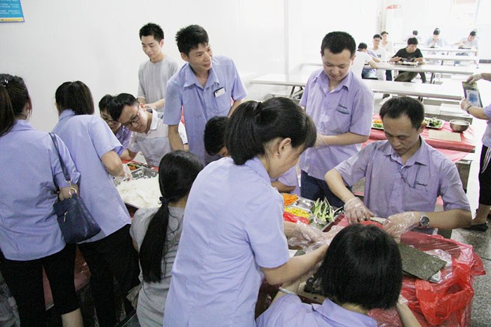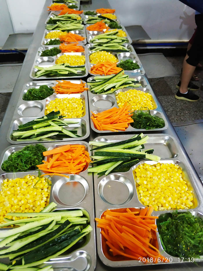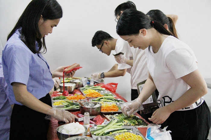 當(dāng)天17:00,小吃貨們翹首期盼的時刻終于來了。大家分工合作,帶上手套切食材,將材料按組分配。