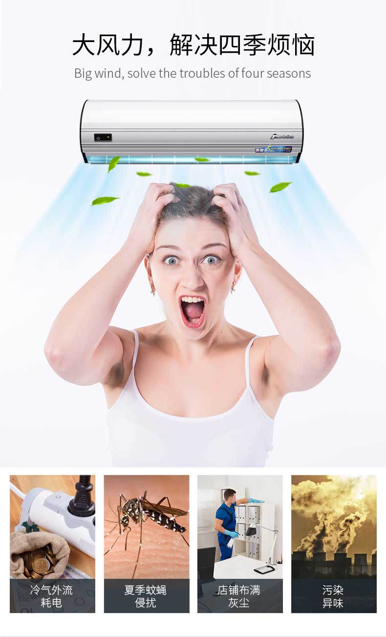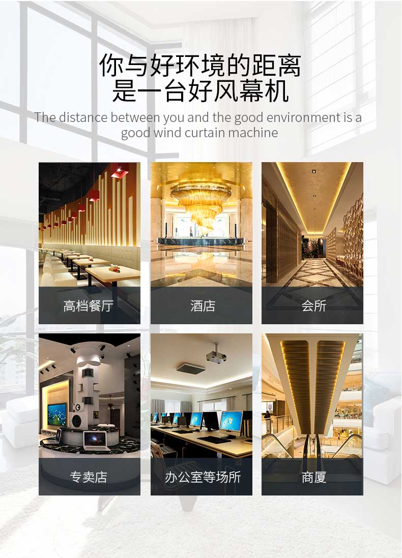 減少室內(nèi)冷氣外流,節(jié)省空調(diào)耗電,適用于需不斷開關(guān)門的餐廳、商店等場所。夏天走進各種開設(shè)冷氣的場所,入口處清涼的強風(fēng)讓顧客頓感涼爽愉悅。