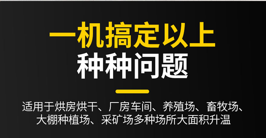 適用于烘房烘干、廠房車間、養(yǎng)殖場(chǎng)、畜牧場(chǎng)、大棚種植場(chǎng)、采礦場(chǎng)多種場(chǎng)所大面積升溫。